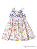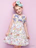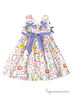 Расклешенное к низу платье без рукавов. Завышенная талия. Полукруглый вырез горловины, застежка на молнию, детский принт. Декоративные бантики из полосатой ткани. Отличный вариант для детского гардероба.