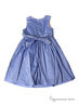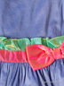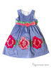 Расклешенное к низу платье без рукавов. Завышенная талия подчеркивается втачным поясом из атласных лент, украшенными декоративной розой спереди и лент из оcновной ткани платья сзади. Полукруглый вырез горловины, застежка на молнию, декоративные аппликации в стиле "печворк".