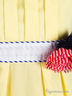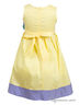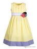 Красивое платье актуального лимонного оттенка украшено широким белым поясом. Спереди пояс украшен оригинальным цветком из ткани, а сзади завязывается бантом. Сам пояс и подол платья декорированы сине-белой оторочкой. Складки на юбке делают изделие более фактурным.