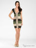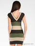 Короткое стрейчевое трикотажное платье без рукавов с глубоким V-образным вырезом. Рисунок выполнен из геометрических полос.