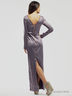 Прекрасное вечернее платье с изюминкой. Модель закрытого классического типа эффектно раскрывается со спины, где присутствует открытая линия плеч и длинная молния, регулирующая вырез. Акцентом модели является застежка на спинке в виде красивой металлической молнии на атласной ленте. Платье для особого случая.