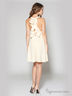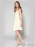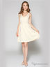 Однотонное короткое платье-сарафан на тонких бретелях, с V-образным вырезом горловины, отрезной линией талии, открытой зоной спины и декольте; декорировано защипами и фигурными воланами на бретелях.