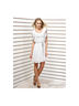 Шелковое платье на подкладке с короткими рукавами и круглым вырезом горловины. Платье декорирована тонким текстильным ремнем на талии и воланами в зоне декольте и на рукавах.