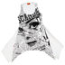 Расклешенная модель необычного кроя на лямках с вставкой, украшенной "газетными" принтами.