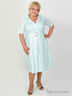 Классическое летнее платье расклешенного кроя. Выполнено из гладкого материала. Отложной воротник с лацканами, короткие рукава, талия подчеркнута поясом с круглой серебристой пряжкой.