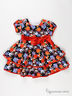 Платье из плотной, мягкой сатиновой ткани. Круглый вырез горловины. Застежка на спине на пуговицы. Короткие рукава с манжетами. Отрезной пояс-оборка, завязывается на спинке крупным бантом. Полочка декорирована бантиком с лентами. Двухъярусная юбка. Тонкая подкладка платья заканчивается нижним ярусом юбки. Манжеты, пояс, бантик и окантовка юбки выполнены из атласа.