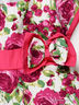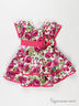 Платье из плотной, сатиновой ткани. Округлый вырез горловины. Застежка на спинке молнию. Короткие рукава. Отрезной пояс-оборка переходит на спине в ленты, завязывающиеся крупным бантом. Полочка декорирована великолепным двойным бантиком. Расклешенная двухъярусная юбка. Модель дополнена тонкой подкладкой, заканчивающейся нижним ярусом юбки.