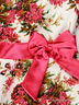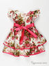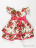 Платье из тонкой, плотной сатиновой ткани. Округлый вырез горловины. Застежка на спинке на пуговицы. Короткие рукава-крылышки. Отрезной пояс-оборка переходит на спинке в ленты, завязывающиеся крупным бантом. Полочка декорирована великолепным бантиком. Расклешенная двухъярусная юбка. Модель дополнена тонкой подкладкой, заканчивающейся нижним ярусом юбки. Пояс, бантик и окантовка юбки выполнены из атласа.