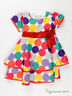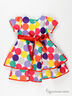 Платье из плотной, мягкой сатиновой ткани. Круглый вырез горловины. Застежка на спине на пуговицы. Короткие рукава с манжетами. Отрезной пояс-оборка, завязывается на спинке крупным бантом. Полочка декорирована бантиком с лентами. Двухъярусная юбка. Тонкая подкладка платья заканчивается нижним ярусом юбки. Манжеты, пояс, бантик и окантовка юбки выполнены из атласа.