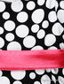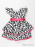 Платье из тонкой, плотной сатиновой ткани. Округлый вырез горловины. Застежка на спинке на молнию. Короткие рукава-крылышки. Пояс продет в шлевки и завязывается на спине крупным бантом. Расклешенная двухъярусная юбка. Модель дополнена тонкой подкладкой, заканчивающейся нижним ярусом юбки. Пояс и окантовка юбки выполнены из атласа.