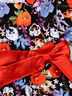 Платье из плотной, мягкой сатиновой ткани. Круглый вырез горловины. Застежка на спине на пуговицы. Короткие рукава с манжетами. Отрезной пояс-оборка, завязывается на спинке крупным бантом. Полочка декорирована бантиком с лентами. Двухъярусная юбка. Тонкая подкладка платья заканчивается нижним ярусом юбки. Манжеты, пояс, бантик и окантовка юбки выполнены из атласа.