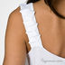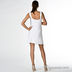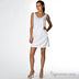 Легкое трикотажное платье-сарафан на широких бретелях, декорированных атласной лентой. Платье короткое, свободного покроя. От левой бретели к низу изделия выполнено декоративное наложение ткани.