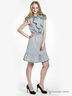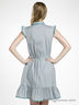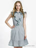 Расклешенная модель застегивается на пуговицы на полочке и на скрытую молнию в левом боковом шве. Отложной воротник. Рукава-"бабочки". Два боковых скрытых кармана. От плеч и до заниженной линии талии, вдоль планки-застежки, пришиты воланы. К подолу пришита оборка со складками. Края изделия обработаны декоративной тесьмой.