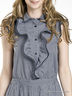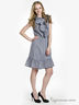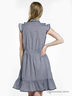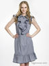 Расклешенная модель застегивается на пуговицы на полочке и на скрытую молнию в левом боковом шве. Отложной воротник. Рукава-"бабочки". Два боковых скрытых кармана. От плеч и до заниженной линии талии, вдоль планки-застежки, пришиты воланы. К подолу пришита оборка со складками. Края изделия обработаны декоративной тесьмой.