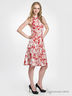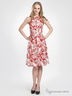 Расклешенная модель застегивается на пуговицы на полочке и на скрытую молнию в левом боковом шве. Отложной воротничок. Лямка на шее. Юбка во встречную складку.