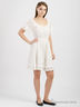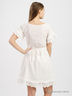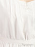 Романтичное платье с красивыми деталями из шитья. Короткие рукава, круглый вырез с 3 пуговицами. Складки спереди. Горизонтальные складки по низу. Воланы из шитья по краям рукавов и низу. Завязывающийся пояс.
