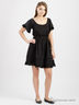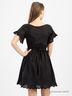 Романтичное платье с красивыми деталями из шитья. Короткие рукава, круглый вырез с 3 пуговицами. Складки спереди. Горизонтальные складки по низу. Воланы из шитья по краям рукавов и низу. Завязывающийся пояс.