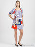 Яркое платье с оригинальным рисунком. Круглый вырез с разрезом и пуговицей спереди. Рукава 3/4. Широкий пояс можно носить как шарф. Прямой крой. Длина 88 см для размера 44.
