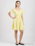 Романтичное платье с красивыми деталями из шитья. Короткие рукава, круглый вырез с 3 пуговицами. Складки спереди. Горизонтальные складки по низу. Воланы из шитья по краям рукавов и низу. Завязывающийся пояс.