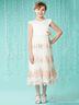 Идеальное платье для любого праздника – светлый оттенок уместно смотрится на любом торжестве и подходит каждой девочке. Атласный верх с круглой горловиной украшен пышными рукавами. Широкий пояс подчеркивает талию, а многослойная юбка украшена по подолу кружевным рисунком. Объемный цветок на поясе играет цветового акцента.