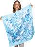 Приятный голубой платок позволит создать множество вариаций в вашем образе. Данный аксессуар можно использовать на голове при оформлении прически, красиво повязать на шее или украсить прическу. Изделие имеет красивый принт с растительными элементами. Размер: 90х90 см.