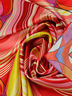 Платок многоцветный из полиэстера, основные цвета желтый, розовый, красный. Принт геометрический - кривые разноцветные диагональные линии разной ширины. Платок из высококачественного итальянского полиэстера, средней плотности, с легким атласным блеском, подшивка края - машинная строчка. Размер: 90х90 см.