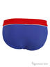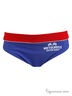 Плавки синего цвета оформлены контрастным поясом, кантом и принтом.