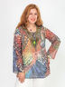 Пляжная туника из прозрачной ткани с красивым ярким рисунком. V-образный вырез со шнуровкой и вышивкой бусинами и пайетками. Слегка расклешенные длинные рукава. Прямой низ с боковыми разрезами. Длина ок.76-80 см. Параметры фотомодели: рост 172 см, российский размер 48.