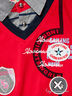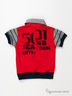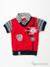 Великолепное поло с эффектом двойки из хлопкового трикотажа. Стояче-отложной ворот. Застежка на пуговицы. Короткие рукава с манжетами. На полочке и спинке крупные печатные рисунки и нашивки.