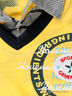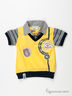 Великолепное поло с эффектом двойки из хлопкового трикотажа. Стояче-отложной ворот. Застежка на пуговицы. Короткие рукава с манжетами. На полочке и спинке крупные печатные рисунки и нашивки.