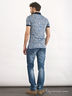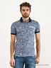 Модное мужское поло из хлопкового трикотажа со сложным принтом. Стояче-отложной ворот. Застежка на пуговицы. На полочке накладной карман. Ворот и манжеты выполнены из однотонного материала.