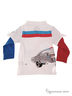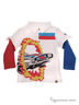 Рубашка с длинными рукавами выполнена из мягкого эластичного трикотажа. На груди застежка на кнопки. Украшением этой модели является оригинальный принт на груди, который переходит на спину. Рукава разных контрастных цветов на манжете. Дополняют их короткие рукава как на футболке. Края изделия необработанные. Прекрасный выбор!