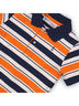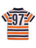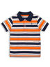 Поло для мальчика с короткими рукава, отложным воротником и планкой с застежкой на пуговицы. Декорирована модель принтом в полоску.