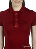 Детали: отложной ворот, короткий рукав, скрытая застежка на пуговицы, планка-застежка украшена сборкой, лентой и стразами