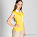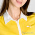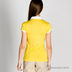 Жёлтая футболка-поло с белыми полосками на рукавах и на воротнике. Из декоративных элементов, так же есть разрезы по бокам, декорированные белыми полосочками.