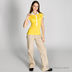 Жёлтая футболка-поло с белыми полосками на рукавах и на воротнике. Из декоративных элементов, так же есть разрезы по бокам, декорированные белыми полосочками.
