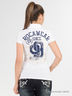 Поло Rocawear, женское, прямого силуэта. Отложной воротник, короткие рукава, застежка на пуговицы, изделие декорировано стразами и принтом.