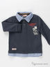 Поло с длинным рукавом прямого силуэта выполнено из трикотажа средней плотности. Эффект двойки. Двойной отложной ворот, застежка на три пуговицы. Рукава посажены на манжеты. Полочка декорирована принтами и вышивкой. Спинка украшена принтами и вышивкой.