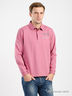 Футболка-поло с длинными рукавами, деталями в рубчик, деталями из саржи на плечах и внизу воротника. Внешняя сторона воротника из серого джерси с отстрочкой, основание и край воротника с плетеной темно-синей тесьмой. Принт и вышивка, нашивка на правом рукаве, отстрочка на планке застежки, разрезы внизу изделия и отстрочка сзади.