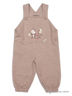 Практичный трикотажный полукомбинезон на каждый день. Модель на регулируемых по длине бретелях на пуговицах. Изделие выполнено из футура с легким "начесом". На талии эластичная вставка-резинка, накладной карман на груди с принтом веселой обезьянки, низ брючин на широкой трикотажной резинке.