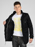 Отличное мужское полупальто черного цвета. Застежка на молнию и кнопки. Воротник декорирован молнией. Спереди четыре удобных кармана с клапаном на кнопках. Полупальто декорировано хлястиками на кнопках и пуговицах. Низ и пояс регулируется по ширине шнурками-завязками. Манжеты выполнены из трикотажной резинки оформленной в рубчик.