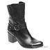 Полусапоги от Cressy, выполненные из черной кожи, поверхность которой стилизована под невыделанную. Модель смотрелась бы достаточно строго и просто, если бы ее не спереди не украшал великолепный ремешок с полукруглой металлической пряжкой, а сзади - декоративная кожаная накладка на клепках. Внутри - подкладка из кожи. Широкий каблук гармонично дополняет модель.