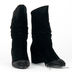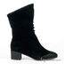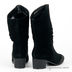 Стильные женские полусапоги из натуральной замши на тонкой жесткой подошве с мелкой протекцией. Внутренняя нижняя часть изделия дополнена натуральным мехом. Декорированы стразами.