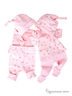 В комплекте ползунки молочного цвета с "ножкой", декорированные милый бантиком и пуговкой, а также ползунки из орнаментального трикотажа без "ножки", что не менее удобно, к тому же это позволяет носить их довольно долго. Ползунки очень комфортны, не стесняют движений малыша. Идеально подходят как для сна, так и в качестве белья на прогулку. Ползунки оформлены деликатным шевроном с надписью Gulliver baby.