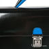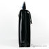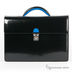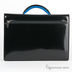Лакированный портфель из натуральной кожи. Твердые стенки. Клапан застегивается на замок с ключем. На задней стенке один карман на молнии. Ручка декорирована вставкой из синей фактурной кожи. Внутри одно большое отделение. Четыре открытых кармана: узкий для мобильного телефона, широкий для мелких принадлежностей и два для ручек.