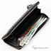 Внутри: три отдела для купюр, двенадцать кармашков для пластиковых карт, отделение для мелочи на молнии. На задней стенке карман на молнии.