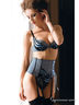 Широкий пояс для чулок выполнен из жаккардового трикотажного полотна с мелким рисунком «гусиная лапка». По нижнему краю в центре спереди аппликация. Сбоку спереди шнуровка на атласную ленту.