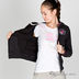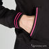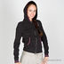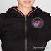 Кофта из плотного флисового трикотажа, спереди под кокеткой небольшая сборка. Капюшон, карманы и рукава отделаны трикотажной резинкой с контрастной полосой. Застежка — молния. Спереди на груди фирменная эмблема с вышивкой.