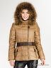 Куртка с длинными рукавами и капюшоном, декорированным мехом. Модель приталенного кроя дополнена поясом контрастной расцветки. Отличный вариант на каждый день.