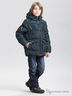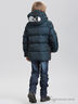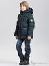 Куртка с двойным пуховым пакетом, прямого силуэта. Центральная застежка на открытую тесьму-молнию, с нижней ветрозащитной планкой. Воротник стойка. Рукав втачной, регулируемый по длине отворотными манжетами с внутренними ветрозащитными трикотажными напульсниками. На нижней части переда вместительные накладные карманы, в верхней части врезные карманы на молнии с декоративными клапанами. Куртка имеет ветрозащитную юбку и датчик контроля температуры. Очки на капюшоне съемные на кнопках.